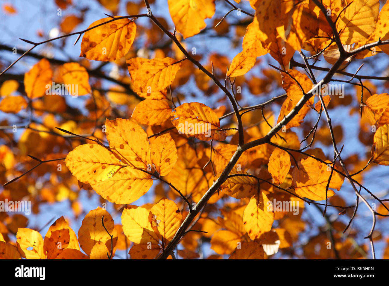 Yellow Beech Tree Leaves In The Autumn Against Deep Blue Sky Stock Photo Alamy